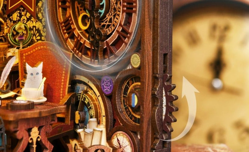 Cada estantería, reloj y pequeño adorno está elaborado con madera cortada con precisión, capturando el encanto atemporal de un estudio mágico.