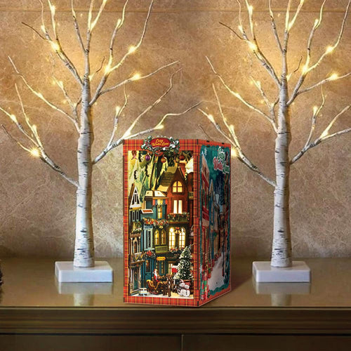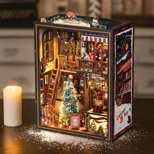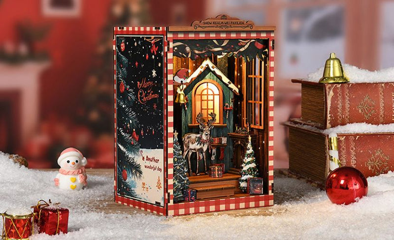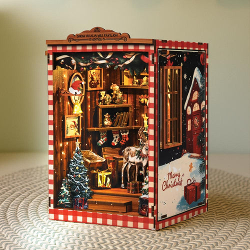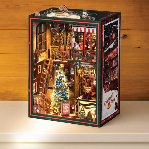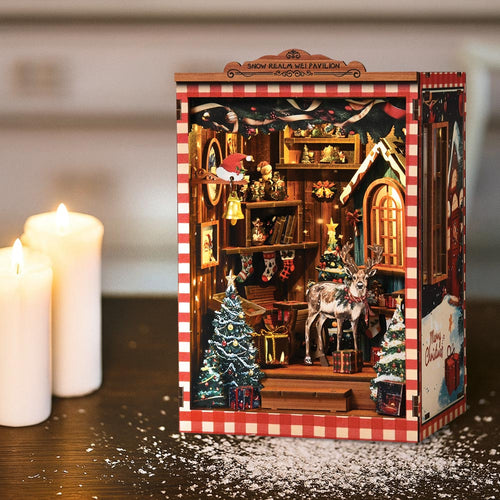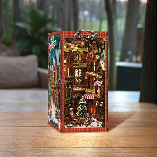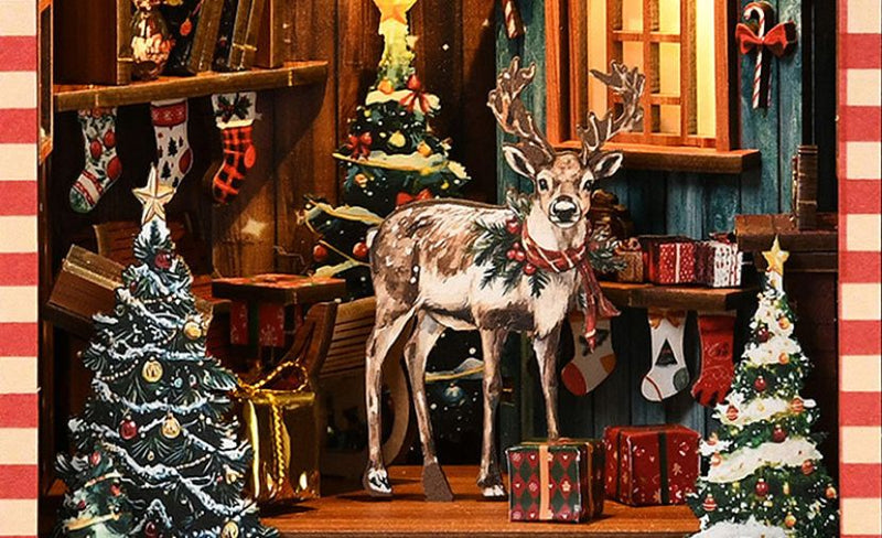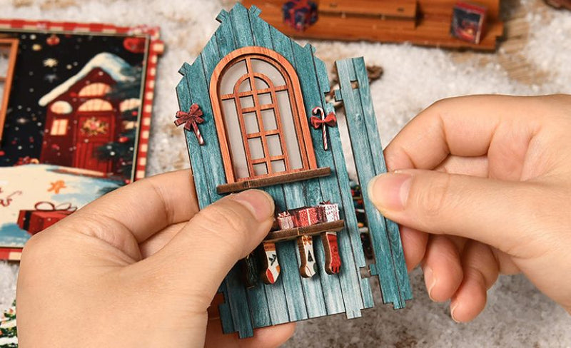 Cada pieza de madera precortada encaja a la perfección, guiándote en la creación de un encantador refugio navideño, desde el marco luminoso de la ventana hasta las estanterías repletas de tesoros de temporada.
