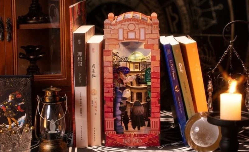 Me encanta cómo este book nook de Diagon Alley da vida al mercado mágico. Los pequeños detalles hacen que parezca que estás caminando por la calle encantada. Es una adición perfecta para mi estantería.
