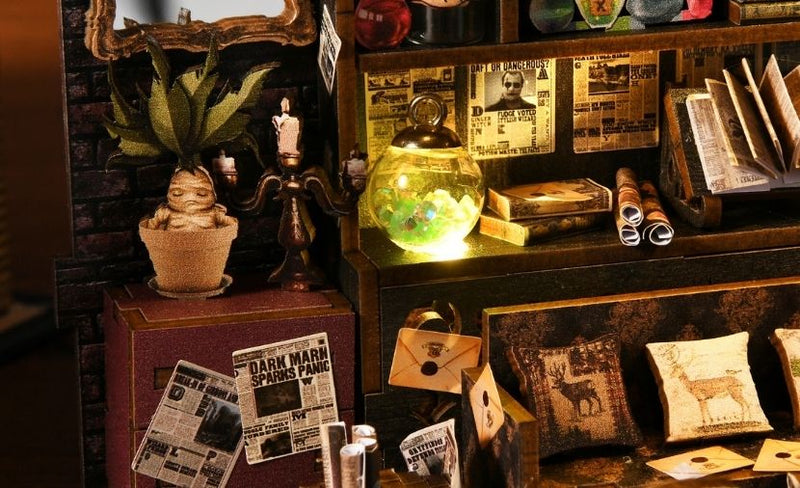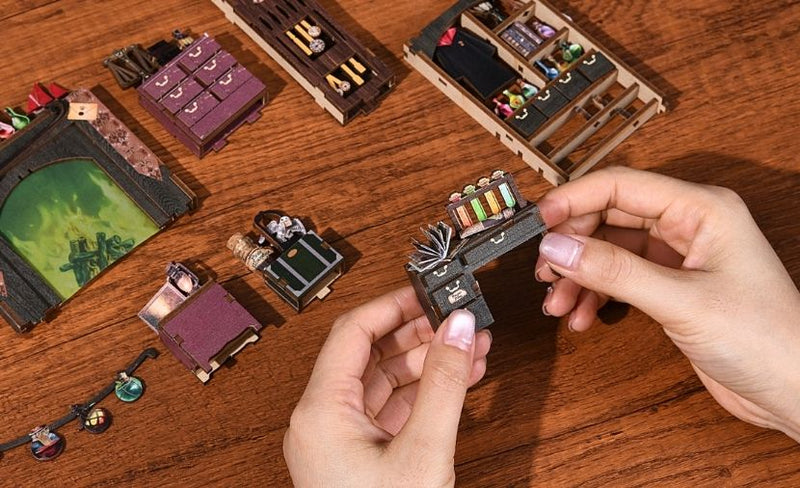 Cada estante, frasco de poción y accesorio extravagante está cortado con precisión en madera, recreando la maravilla de un taller de mago en miniatura.
